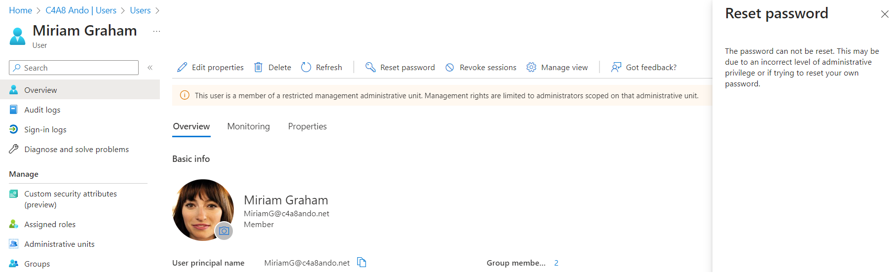 Insufficient privileges to complete the operation. Target object is a member of a restricted management administrative unit and can only be modified by administrators scoped to that administrative unit. Check that you are assigned a role that has permission to perform the operation for this restricted management administrative unit. Learn more: https://go.microsoft.com/fwlink/?linkid=2197831